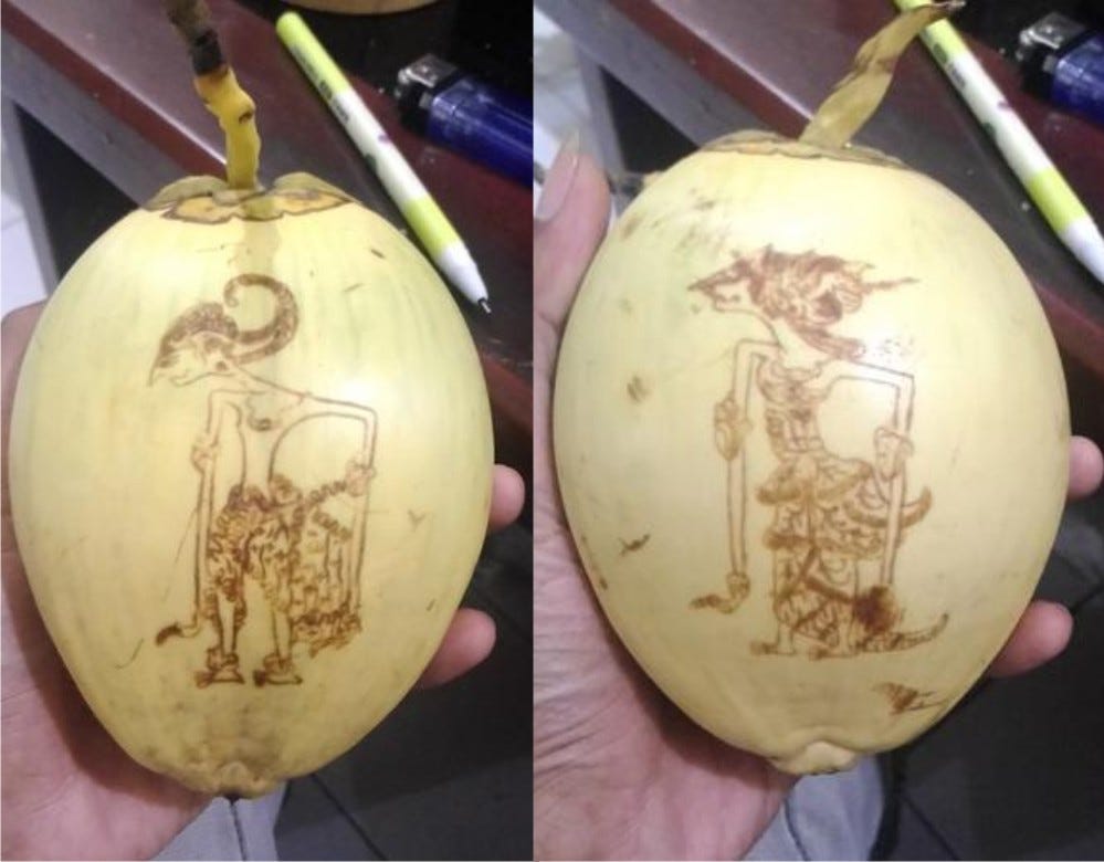 Calon ayah harus memecah kelapa gading tersebut, jika mengenai gambar kamajaya . Cengkir terdiri dari 2 gambar wayang yaitu janaka dan srikandi. Kelak akan menjadi tokoh wayang seperti di gambar tersebut. Gambar wayang di kelapa untuk tingkepan atau 7 bulanan hamil.no wa 082210114010. Lukisan untuk mitoni cuma gambar arjuna dan srikandi," cerita jurnalis tv9 ini.